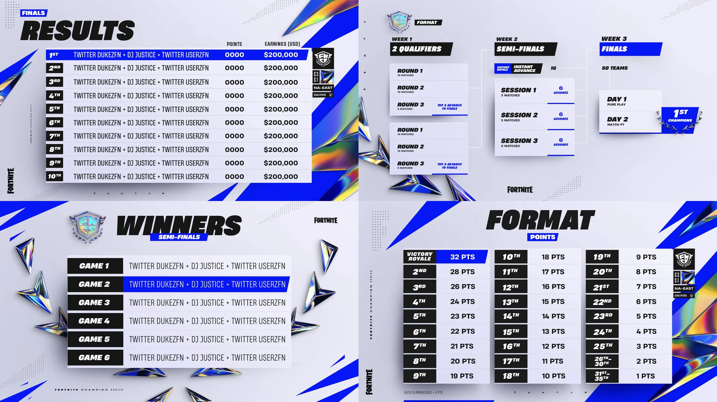 One of the biggest challenges was finding the right balance between looking like Fortnite and FNCS being its own thing. Shards and angled boxes is a prominent design tool from the game and carrying that over to FNCS brought us in that sweet spot.