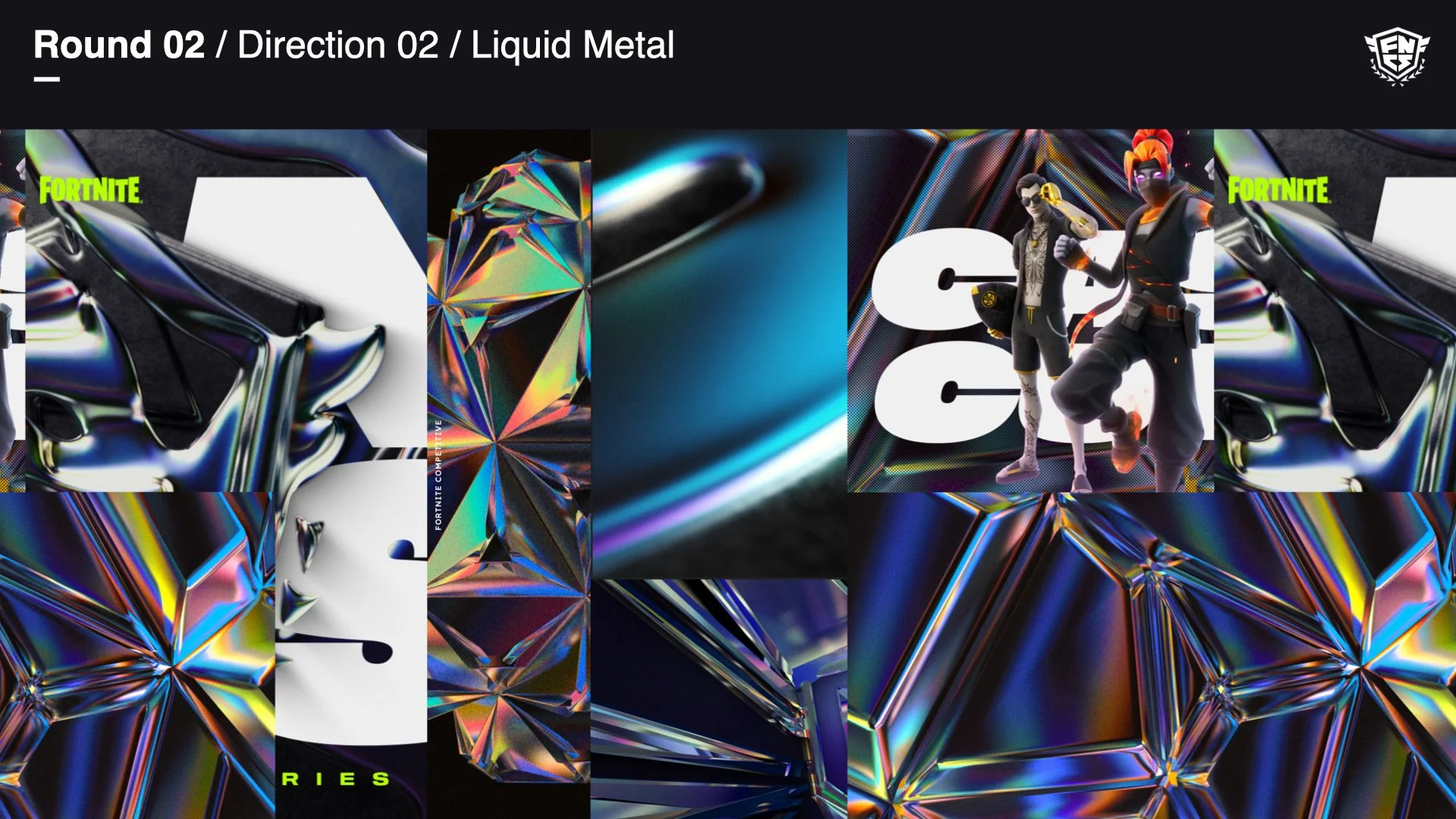 Direction 2 (done by another designer) stands out with its cg chromatic liquid that solidifies into geometric forms, an homage to the fortnite style. The color and reflected tone changes throughout the year for each tournament type.
